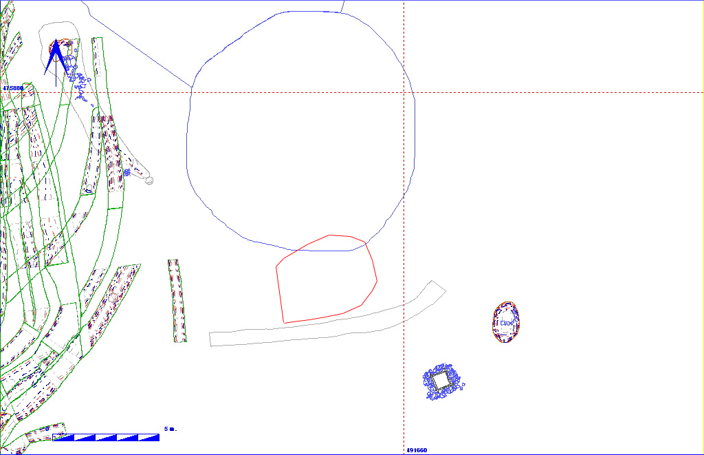 This was a layer of dark blue/black clay (Munsell colour not recorded). The deposit was sealed by a brown stony layer (011AD00007). Although not fully excavated, a box section (011AD00015) was cut through part of the western extent of this deposit. No dimensions were recorded for this deposit, so the extent has been estimated using its relationship with contexts 011AD00007 and 011AD00015.